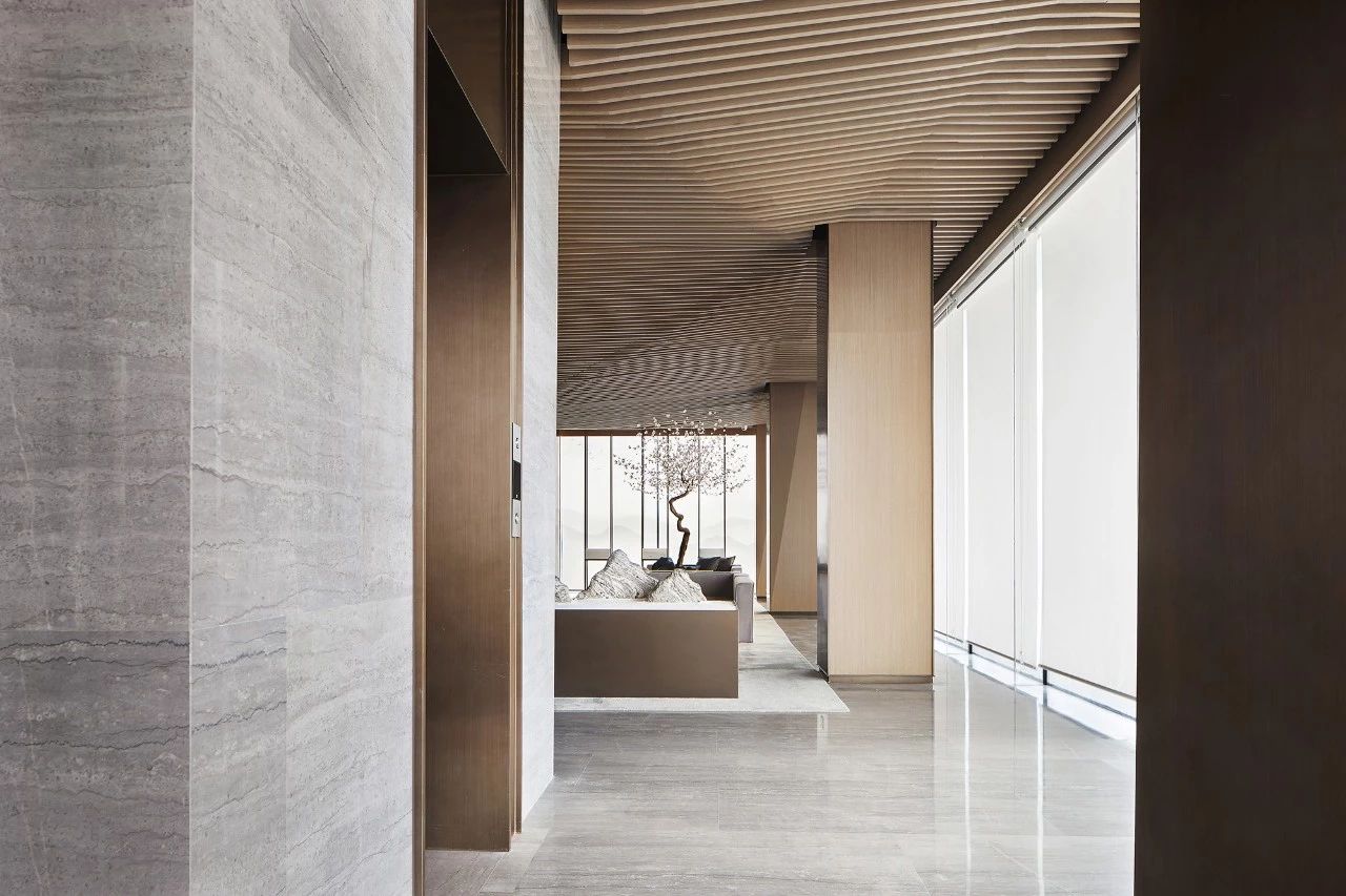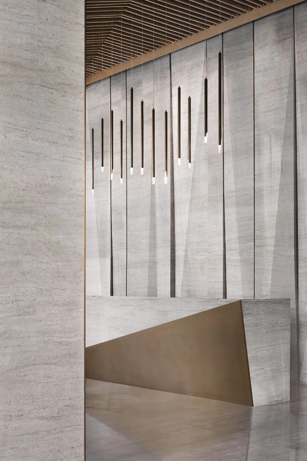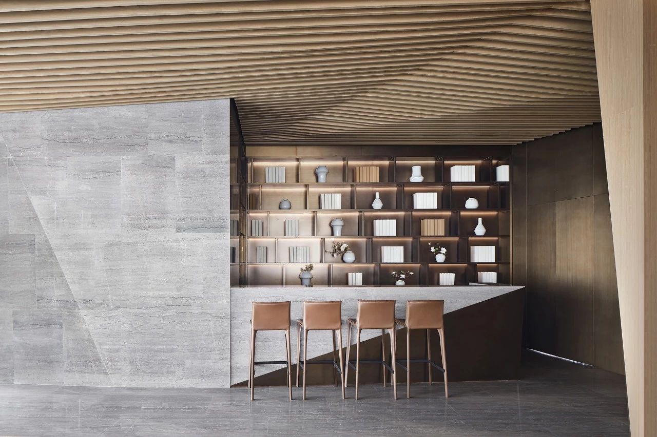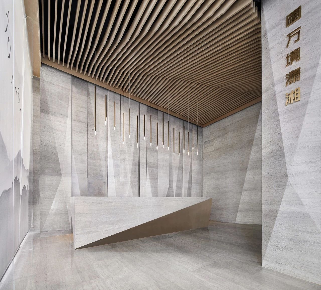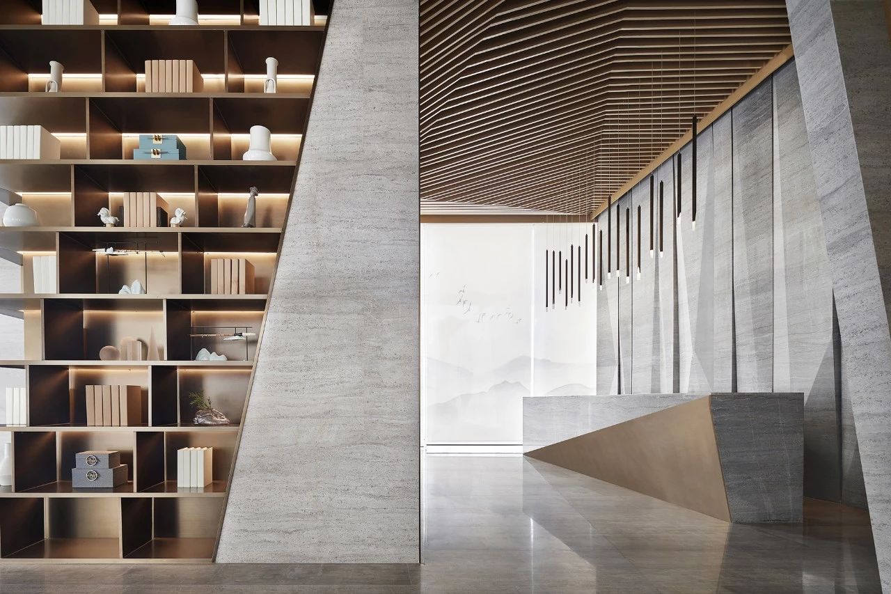 步入空間,平沙落雁之景描于水墨畫卷上,三五成群的大雁,空際盤旋,倏隱倏顯,定格其間雅致素凈的玄灰主調,近相呼應室外山水景觀意境。設計師從棱角分明的霧凇切割面獲取靈感,以幾何立面體塊的形式重構了接待臺與背景墻,融注進當代藝術的氣息,在視覺變幻中,展呈美學萬象的不同截面。