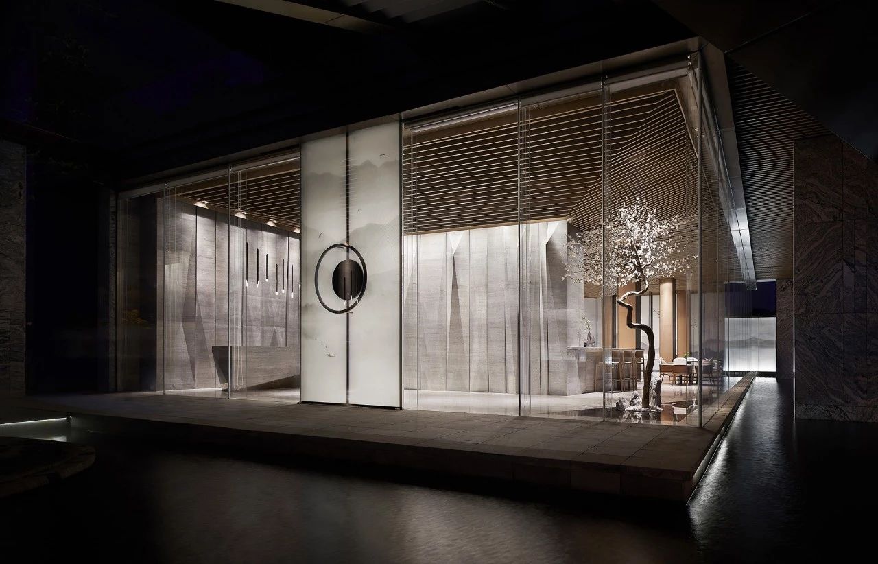 木藝天花的不規則層次,恰似山巒的連綿起伏狀,又如玲瓏精致的霧凇切割面,設計的寓意游走在虛實之間,于東方情致的隱喻中,并置為空間格調的韻腳,立意高遠,詩性曠達。一株梨樹立于山石端景上,遠觀有霧凇般的清透玉質,滿目玉樹瓊枝,凝住“梨花千樹雪”的高意雅境。大面積的玻璃軒窗,搭配水墨疊峰的卷簾,一開一闔間,意境互換,室內外的自然與人文相融共生。
