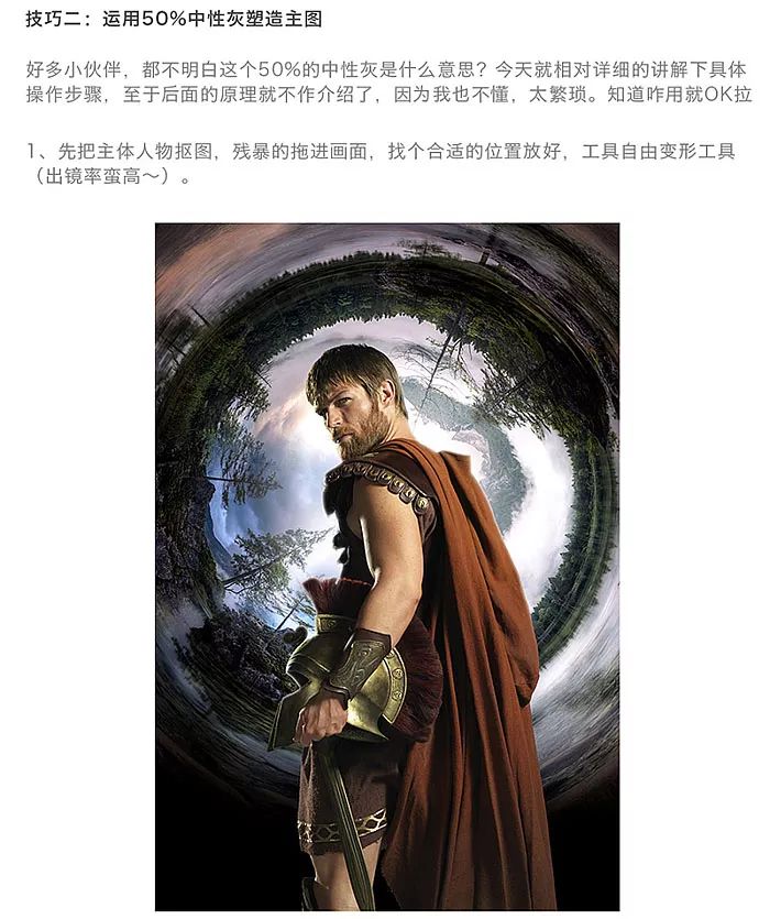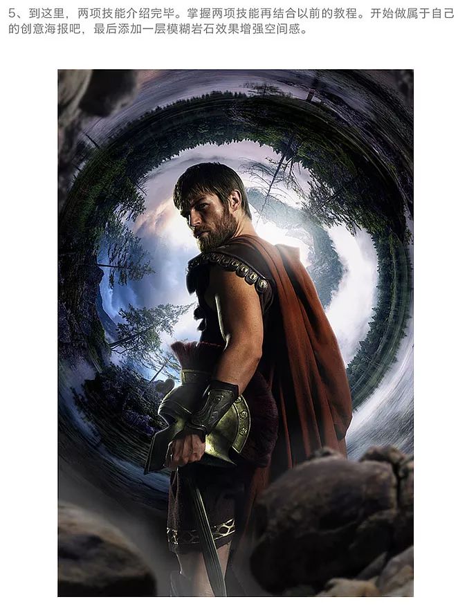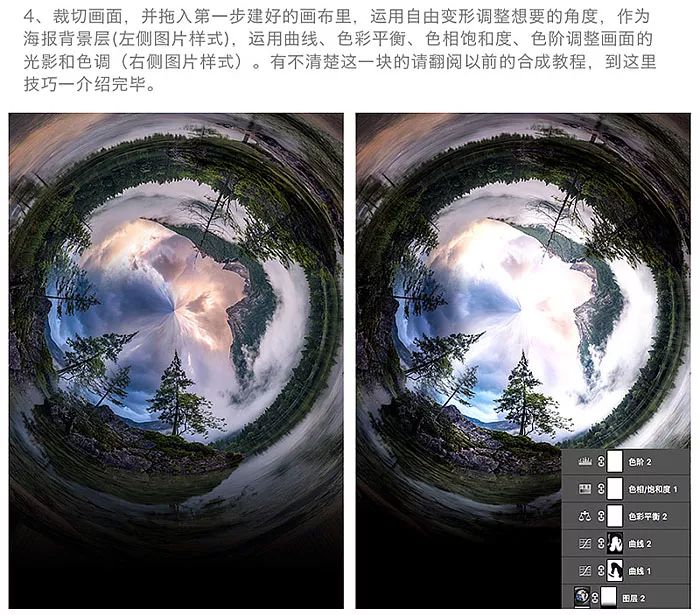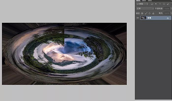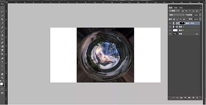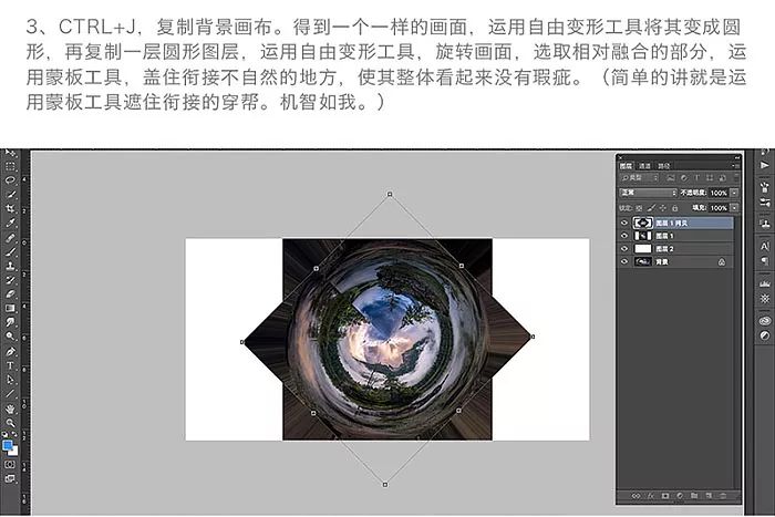 3、Ctrl + J 復(fù)制背景畫布,得到一個一樣的畫面,運(yùn)用自由變形工具將其變成圓形,再復(fù)制一層圓形圖層,運(yùn)用自由變換工具,旋轉(zhuǎn)畫面,選取相對融合的部分,運(yùn)用蒙版工具,蓋住銜接不自然的地方,使其整體看起來沒有瑕疵。