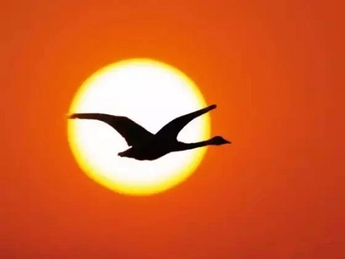 由于是逆光拍攝,飛鳥在畫面中所占的比例較小,很自然地形成了剪影。拍攝日落,時間的選擇尤為關鍵。日落時分晚霞瞬息萬變,而且,美麗晚霞出現的時間往往短暫到僅有一二十分鐘,必須搶拍。拍攝日落時的 飛鳥,對攝影器材的要求也比較高,一臺高速連拍的相機必不可少,以免錯過精彩的瞬間,長焦鏡頭也有其用武之地,可以用來拍攝局部美景,壓縮空間,用以放大和突出飛鳥。拍攝落日要控制好曝光量,對著太陽與畫面邊緣之間的地方測光,以測得的曝光值作為曝光依據,適當的過暗會使傍晚霞光得到強化,若曝光過度則會 造成畫面的色彩失真,減弱視覺的沖擊力。