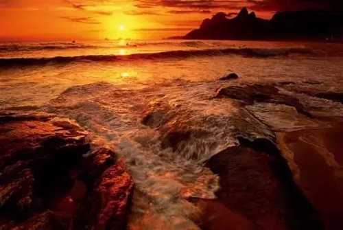 日落時分如果是在海邊拍攝的話攝影者可以利用水面的倒影使太陽的光輝發散開來。低角度日落構圖-在水平方向上用三分法分割畫面后攝影者可把太陽安排在畫面的左上側以洶涌的波濤為中心來安排整個畫面這樣能表現出強勁