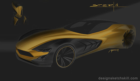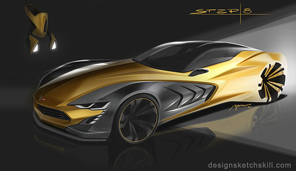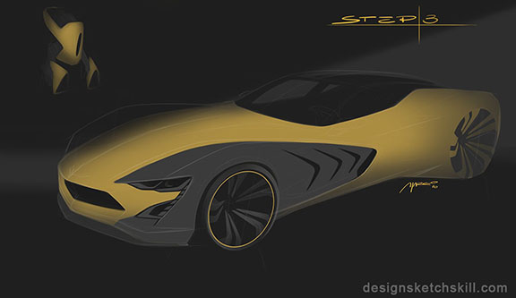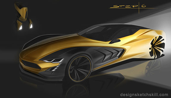 8.最后就是細節的表達,這種手繪細節表達不多,主要是對車身光影的一種表達,其他都是帶過的,比如車燈和輪轂,這些都畫的比較簡單,簡單的表達下特點就行。
