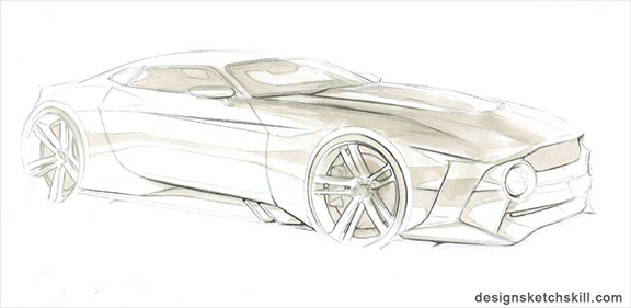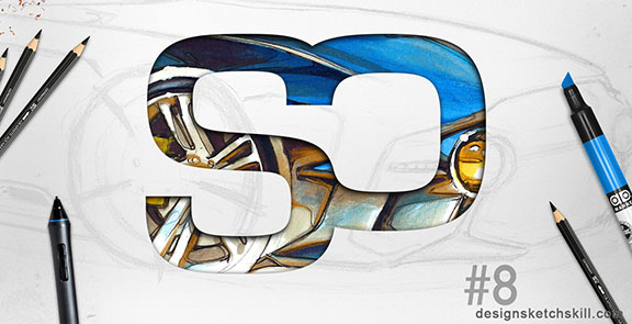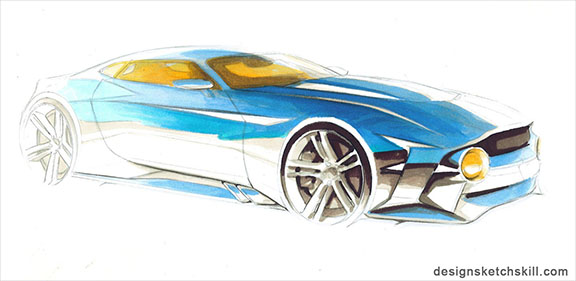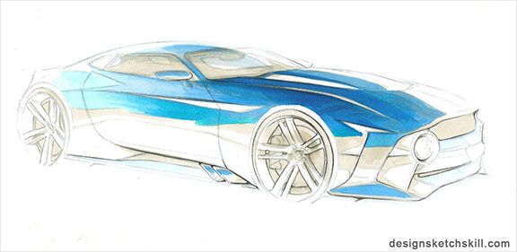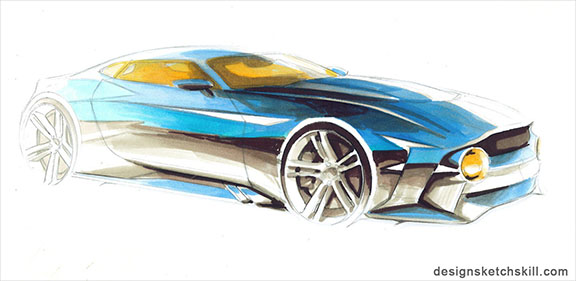 一款汽車馬克筆上色教程,采用AD馬克筆繪制,汽車車身反光材質很明顯,地面反射和車身材質兩種顏色的高對比中間加黑色,這種汽車車身材質是一種非常常見的反射材質表達,對比很強,同時冷暖馬克筆的對比,視覺沖擊很強。AD馬克筆是一種墨水非常足顏色非常正的美國馬克筆。