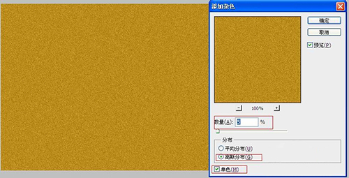 首先簡單的做一個背景,新建500*400的顏色為(R185/G140/B27)的背景圖層,按住alt鍵雙擊背景圖層,使之變成普通圖層,執(zhí)行濾鏡-雜色-添加雜色(數(shù)量為5;高斯分布;勾選單色),然后圖像-調(diào)整-亮度/對比度(亮度為-75)點擊確定。