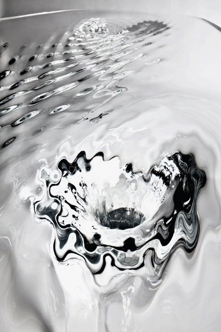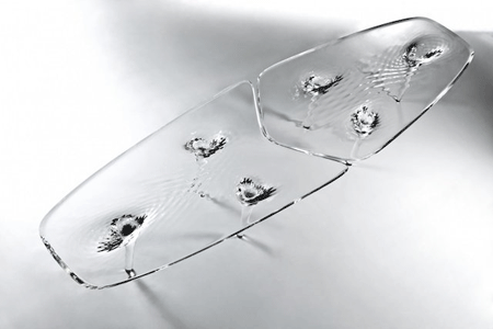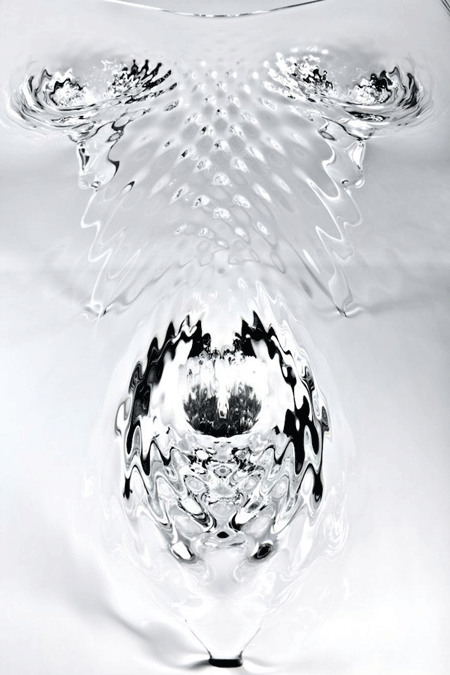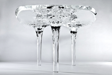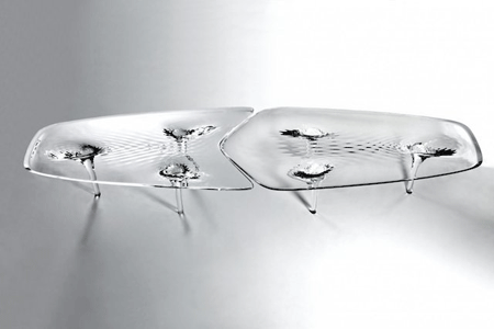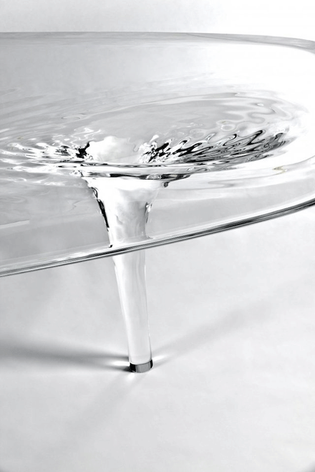 這是由zaha hadid(扎哈·哈迪德)設(shè)計(jì)的“流體冰桌”模仿了兩股互相纏繞的水洼,三個(gè)清澈的水柱從水洼中流下,凝結(jié)成冰,變成支撐桌面的桌腿。這個(gè)設(shè)計(jì)巧妙的捕捉了水的漣漪,用類(lèi)似玻璃的丙烯酸材料創(chuàng)造出微妙精致的質(zhì)感。桌面經(jīng)手工打磨拋光,對(duì)周?chē)澜绠a(chǎn)生了夢(mèng)幻般的折射效果。