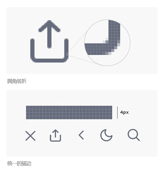 icon的一致性做得很好,描邊控制在兩種尺寸,對描邊的端口、轉折都進行了圓角處理,同一區域各個icon的視覺尺寸統一和諧。這體現了“百度閱讀pro”的專業性,傳達了品牌形象。