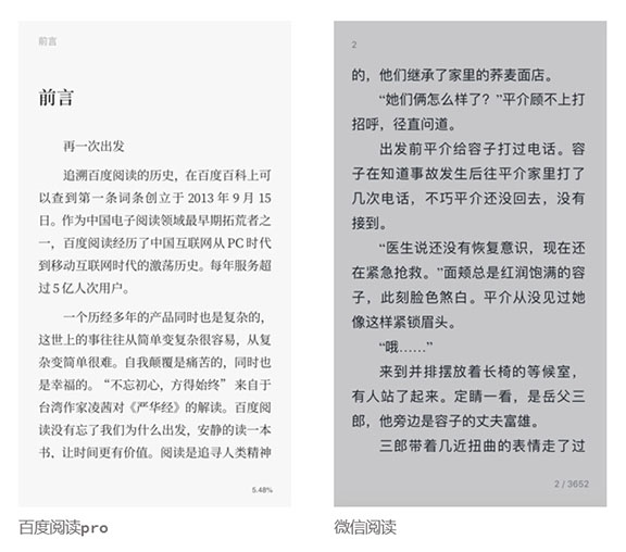 “百度閱讀pro”的色彩運用十分克制、有序。醒目的品牌藍色作為點睛色突出重點信息,其余信息根據優先級分別采用不同飽和度的黑灰色。這一色彩體系提高了信息的傳遞效率,符合“提供舒適的沉浸式閱讀體驗”的產品目標。過于豐富的色彩體系會分散用戶的注意力,而該app避開了這一陷阱。并且,用戶的閱讀場景既可能是安靜的室內,也可能是喧囂的地鐵,所以簡潔的配色能夠幫助用戶在不確定的閱讀環境下提高閱讀效率。