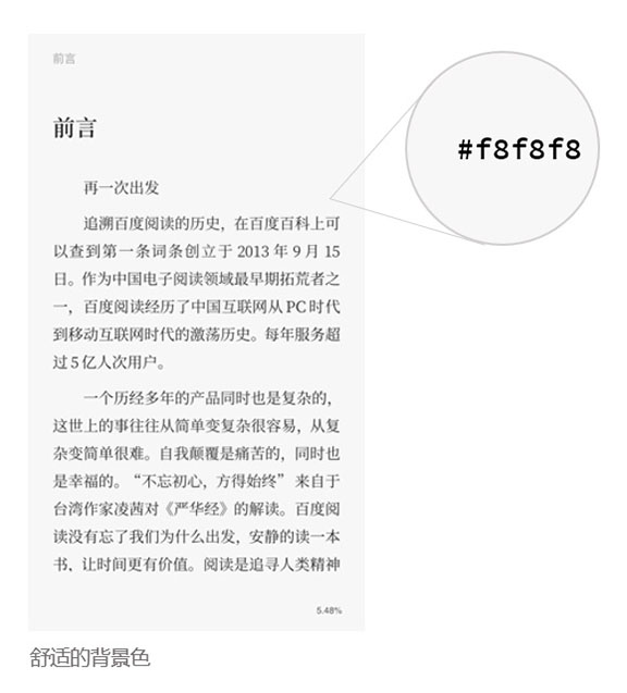 此外,這個app還有一個貼心的小細節。眾所周知,長時間用手機閱讀會引起眼睛不適,為了減輕用戶的壓力,“百度閱讀pro”在閱讀界面采用了色值為#f8f8f8的背景色,避免文字與背景對比過于強烈,更適于長時間閱讀。