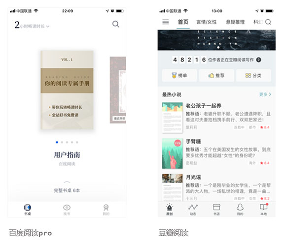 “百度閱讀pro”采用了大面積留白、去灰底、去分割線的布局方式,利用舒適的間距劃分信息,去掉一切不必要的元素,使用戶瀏覽盡可能的流暢無阻。這種布局方式比較新穎獨特,給人留下深刻印象,貼合目標用戶的審美趨勢。并且欄目內容排版也比較簡潔大氣,內容層次分明,瀏覽節奏舒適。與“QQ閱讀”密集多變的布局風格相比,“百度閱讀pro”顯然更有呼吸感、通透感,而沒有壓迫感。