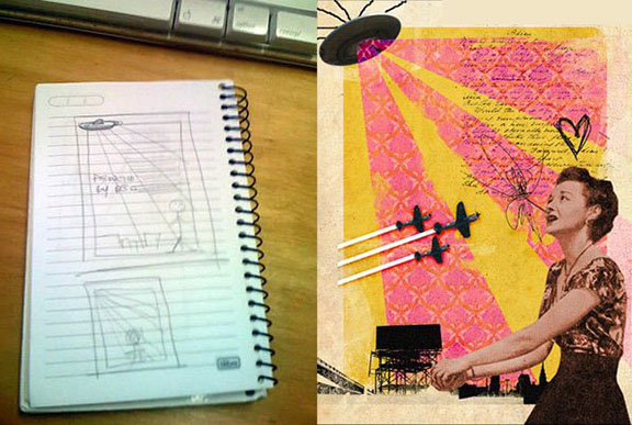 用Photoshop設(shè)計(jì)炫酷復(fù)古學(xué)院 教程中,F(xiàn)abio向我們展示了在借助于電腦之前,如何快速的畫草圖。如下圖所示,他只將基本的元素描出來。通過與右邊最終圖像的對(duì)比,我們可以看出左邊草圖已經(jīng)基本體現(xiàn)出布局。因此,在借助Photoshop之前,你并不需要精湛的繪畫能力。