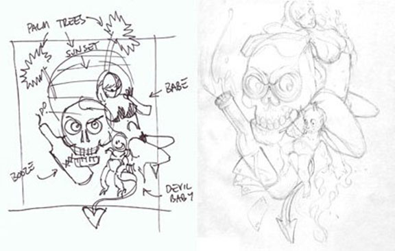 在由草圖到矢量圖一文中,GoMedia的比爾說他們盡可能早的去獲得客戶的認(rèn)可。在畫出更精確的草圖前,他們將一系列粗略的草圖拿給客戶。左下圖是客戶從中挑選出的草圖。在草圖經(jīng)由電腦制作之前,先畫出如右下圖一般更具體的草圖。