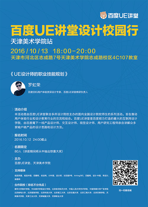 本次校園行是由百度UE講堂聯合多所設計院校主辦,百度UE講堂是百度傾力打造的用戶體驗設計學校,旨在向供不應求的互聯網用戶體驗(UE)設計市場輸出百度一線設計師的實戰經驗。百度UE講堂將是最大的互聯網設計(UE)學院,百度麾下眾多一線產品設計師、交互設計師、視覺設計師、用戶研究工程師等將傾囊相授,按照課程系列歸門別類,已經并將持續進行高質量精品課程的研發與輸出。