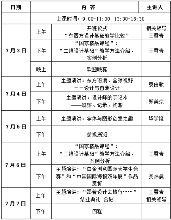 本次培訓為期5天,開班時間2017.7.3—2017.7.7(7.2為報到日)。王雪青教授將以設計類專業基礎課程及國家精品課程為案例,對設計教學理念與方法的時代性升級進行深入剖析,展示新時期設計教學改革的新思路,為中國設計教育同世界接軌提供多元互補、和而不同的教學模式。培訓結束后會發放課程結業證書。