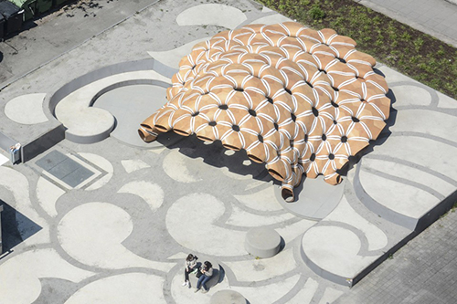 這個(gè)蓬狀結(jié)構(gòu)的最大亮點(diǎn)在于分段式木板仿生結(jié)構(gòu)與自動(dòng)化紡織技術(shù)的結(jié)合。微彎的雙層樺木板以沙海膽結(jié)構(gòu)形態(tài)為原型,而自主研發(fā)的縫合技術(shù)將大大減輕木質(zhì)結(jié)構(gòu)體的整體重量,讓分段式木板組合而成的殼狀結(jié)構(gòu)的性能得以發(fā)揮至最大。