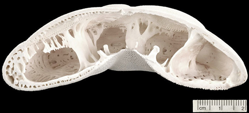 內(nèi)部結(jié)構(gòu)的圖像和掃描結(jié)果顯示,兩種生物體分段式輕質(zhì)結(jié)構(gòu)的牢固程度不僅與板塊的排布組合方式相關(guān),也受其雙層系統(tǒng)的幾何形態(tài)以及具體材質(zhì)的影響。而除了齒狀咬合接頭外,部分海膽的外殼還以纖維進(jìn)行了加固。設(shè)計(jì)小組認(rèn)為多重連接方式保證了海膽外殼穩(wěn)定性,讓其在危機(jī)四伏的海洋環(huán)境中得以安全成長(zhǎng)。