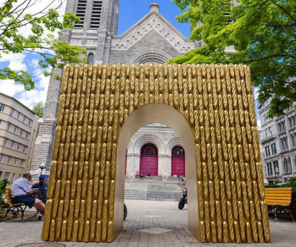 魁北克藝術家 Sarah Thibault 用法棍與當地最著名天主教堂的門洞完美對齊。法棍面包是最日常的食物,但黃金又象征著巨大的財富,Sarah Thibault 很愛挪用沒有直接關聯的視覺元素對權力展開諷刺。