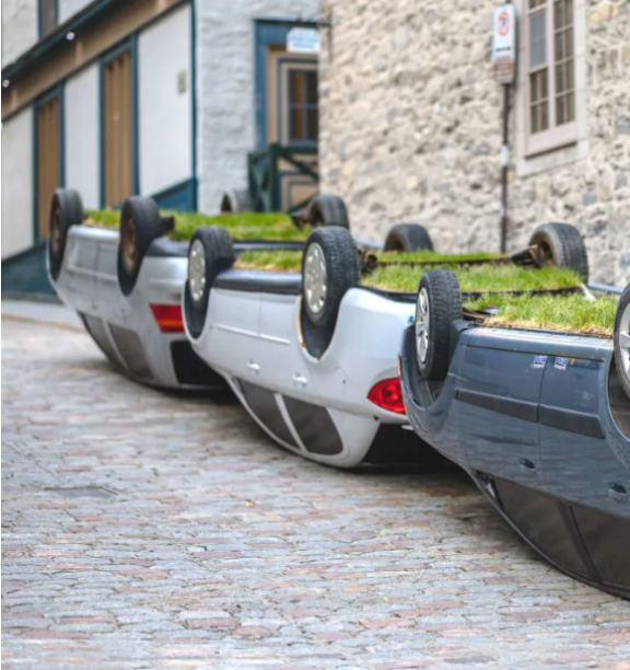 過去他把大巴車改成泳池,把舊福特改成移動烤箱或許是出于玩心,但這輛《翻轉草坪車》卻表達了對可持續發展的關注,車位變成街道綠化空間,批判著消費主義對公共空間的占用。貝內代托·布法利諾把車顛倒,希望人們能暫停駕駛,花點時間坐下來,慢下來。