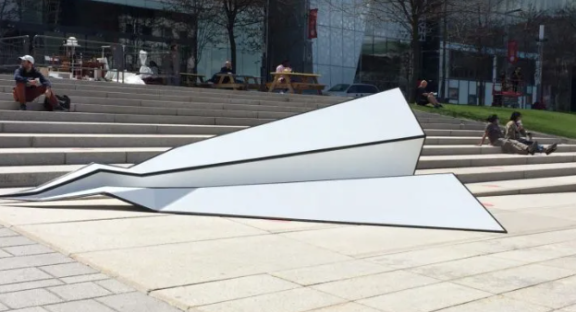 這架“紙飛機”也是所有裝置中頗受歡迎的一件,紙飛機往往象征著童趣、夢想等充滿希望的情緒,但這架頭部受損的紙飛機傳達的是一種悲觀的心態。