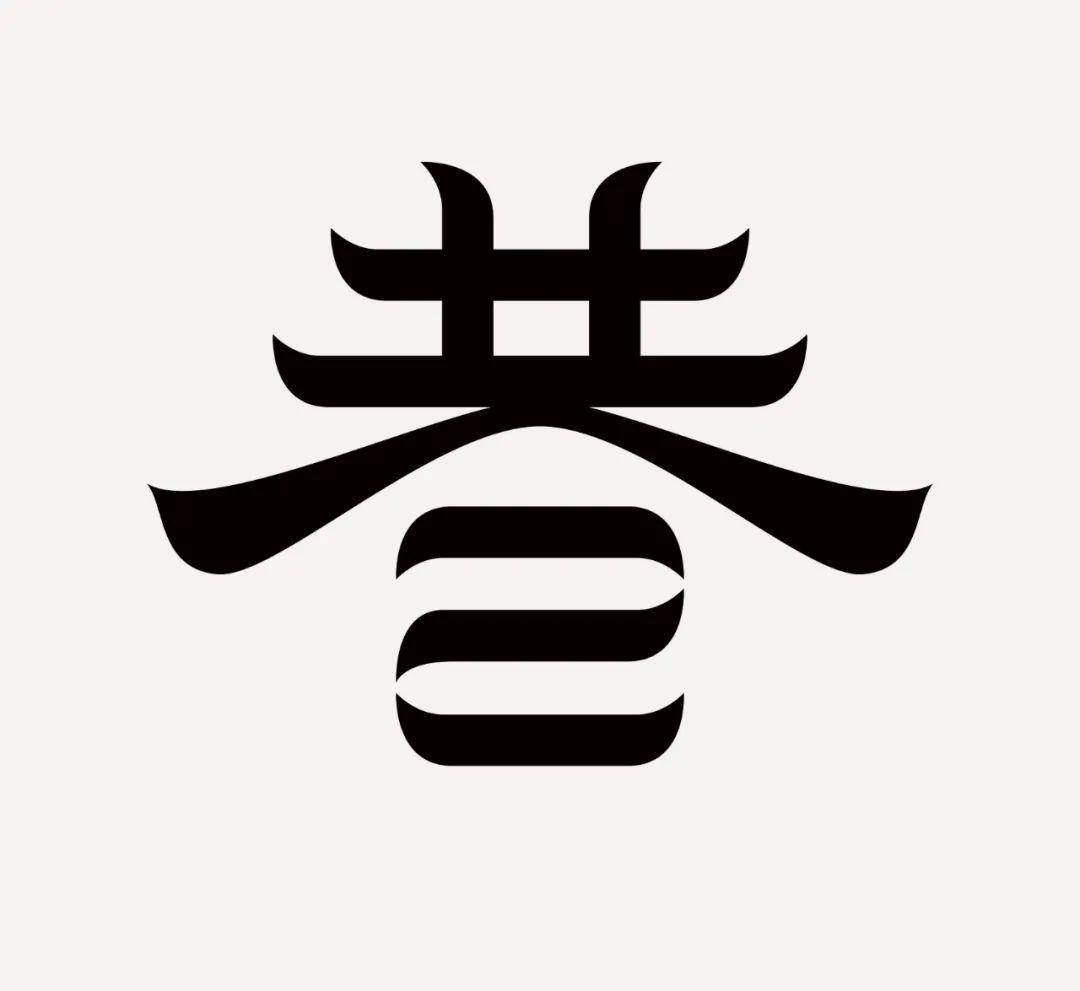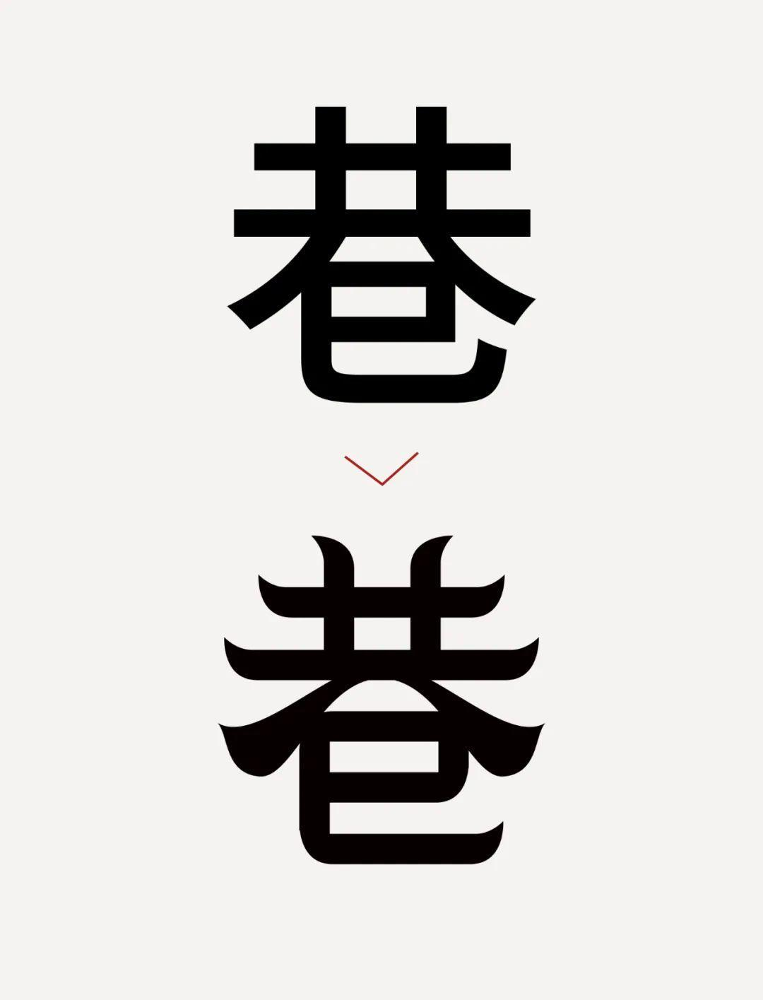 “巷里”,是一家中式餐館,根據名稱,能聯想到飛檐翹角,先來做“巷”字,參考黑體字,給筆畫做變形,起筆和收筆處都融入尖角。