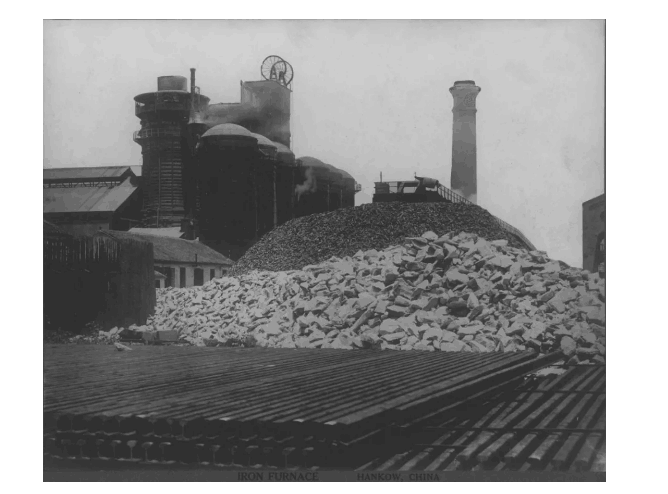 中國漢口鐵爐這張照片,展示了一個典型的現代高爐及其周圍環境。爐子本身是最左邊的塔。在這樣的熔爐里,鐵礦石、石灰石和燃料(焦炭或煤)按照比例,被傾倒在爐頂并燃燒。這些爐子日夜不停地運轉,通常直到它們需要修理為止。燃料的燃燒是由爐下部的空氣爆炸所輔助的,并且產生了強烈的熱量。在圖中所示的六個圓塔中,空氣被來自爐子本身的廢氣加熱,石灰石在高溫下作為一種“熔劑”,使礦石比其他地方更容易熔化。金屬鐵和爐渣形成后落到爐底,然后從爐底取出。需要不停的在爐頂添加新礦石、石灰石和燃料。這種爐子的產品是生鐵,用于鑄鐵制品的生產,或通過多種工藝轉化為鋼。在圖中央的爐子旁邊,是一堆鐵礦石,前面有一堆石灰石。在前景中,堆放了軋鋼廠大量的產品鋼軌。這樣的鐵爐,在美國和歐洲都有,世界上有鐵礦石礦藏的其他地區也有。在中國這樣的地方,鋼鐵廠一般由歐洲或美國人管理。