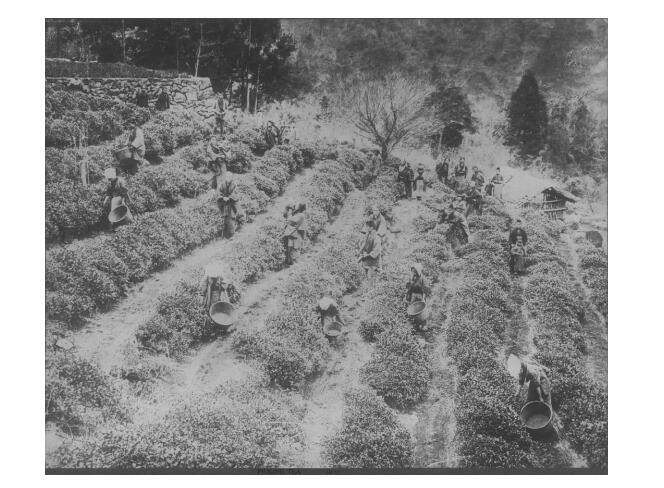 茶由一種灌木的幼嫩葉組成,主要栽培在中國、印度、日本、錫蘭和爪哇。這種植物的高度為10到20英尺,但在種植園中它被修剪成一棵的茶樹。它一般都是從種子中生長出來的,茶樹被種植成一排排的,如圖中所示。茶樹第三年后才可以產茶,從那以后可以采集六到七年的葉子,之后必須砍掉老枝杈,才能更新嫩枝。大約到15年樹齡時,這些植物就會停止盈利,并且通常會被砍掉。采摘是一種非常精確的操作,按照他們的規則,只雇用婦女和兒童,男人們只忙著養護樹樹。在所有產茶葉的國家,人們通常用小竹籃來保存采摘的葉子。在這個季節里,采摘者只從三到六歲樹齡的茶樹上采摘幼芽的頂端。老葉子更硬,更苦,不適合做好味道的茶。這是在日本拍攝的,展示了一個典型的在山坡上的茶園。在日本,那里的田地一般都是茂密的,茶葉大多是在山坡上種的。在印度,茶樹可以長得更高一些。前景中的一排女孩,每個人都有一個籃子,采摘者用手指甲掐掉樹葉,留下一片大一點的葉子。在錫蘭、印度和爪哇的熱帶茶園里,采摘過的茶樹很快會愈合,而在較冷的地區則慢一點。如中國北部,葉子被采摘得非常頻繁,植物腐爛的地方也會很快彌合。在有的地方,茶樹只能采摘一到兩次。第一次收獲的葉子,就是最好的茶。一摘下來,葉子就被小心地放好了。如果要制作綠茶(比如在日本和中國的部分地區),它們會“用木炭火加熱、烘干、分類和包裝”。在其他以紅茶為主要原料的國家,茶葉在進行這些操作之前會稍微發酵,出口茶葉則“再燒一次,以便更徹底地烘干。”