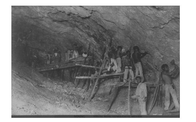 這張照片是在墨西哥一座大型銀礦中拍攝的,非常清楚地展示了開采礦石所采用的原始方法,甚至在今天也是如此。土生土長的工人們,在微弱而不確定的蠟燭光下工作。蠟燭沿著工作面,放置在巖石的縫隙間。他們用鑿子和錘子砸碎巖石,從底部開始往上,朝隧道的頂部開采。在開采中,偶爾會用火藥或炸藥進行小爆破。這里有說英語的礦工,也有會說墨西哥語的工人,他們是在采場里鑿取礦石。墨西哥的礦井,一般都是按照所謂的“老鼠計劃”掘進的。也就是說,在一些墨西哥礦山的礦脈后面挖洞,工作是以一種不那么原始的方式進行的,而且用電鉆在巖石上挖洞進行爆破。然而,由于拉合爾的廉價和運行機械所需的煤炭價格高昂,以一種非常艱苦的方式開采礦石往往更經濟。如果礦工每天得到50美分的話,他們的工資就很高,而煤的價值是每噸20美元以上。礦洞一般較窄,為了取出相對較少的礦石,必須去除大量的無價值巖石。為了避免不必要的勞動,他們會把從巖壁上鑿下來的材料重新分類,將似乎有價值的部分仔細地重新分離后搬運到地表面,盡可能多地將無價值的巖石留在地下。銀礦石通常無法用眼睛辨別其含量,只有很少的情況下,銀才以微小的鱗片或小線狀的形式出現,它一般都是與其它化學物質混合在一起。因此,只有熟練礦石的人,能辨識它的價值。墨西哥僅次于美國,是世界上最大的銀生產國,一些含量高的銀礦,在西班牙被征服之前就已經開始開采了,而這個國家的巨大財富——白銀和黃金,是他們遭受入侵的主要原因。