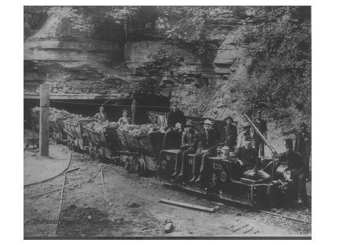 西弗吉尼亞州費爾蒙特煤礦的入口處,一些礦工坐著裝滿煤炭的礦車來到地表。在這個礦井里,礦車在小鐵軌上行駛,是由一輛電力礦用機車作為動力的,電力機車是從一根架在空中的鐵絲上得到動力電的。礦車被拉到“尖頂”處,煙煤會被直接傾倒在鐵路車廂中運輸。美國有幾條鐵路,其主要業務是煤炭運輸。在這里,煤沿山坡露出頭來,煤層幾乎是水平方向延伸,這樣汽車就可以在一個水平上行駛了。有些煤層在地下深處,只能通過豎井抵達。在地下,煤是用礦車運到豎井口,再用升降電梯吊到地面。礦工帽子上裸露的燈表明,這個礦井通風良好。有些礦井里含有危險的爆炸氣體(沼氣),因此礦工必須使用安全燈。許多礦井用電燈照明,幾乎所有的煤礦都是通過大型水泵和風扇向礦井各部分提供新鮮空氣,從而消除了由于工人的呼吸而產生的各種有害氣體。