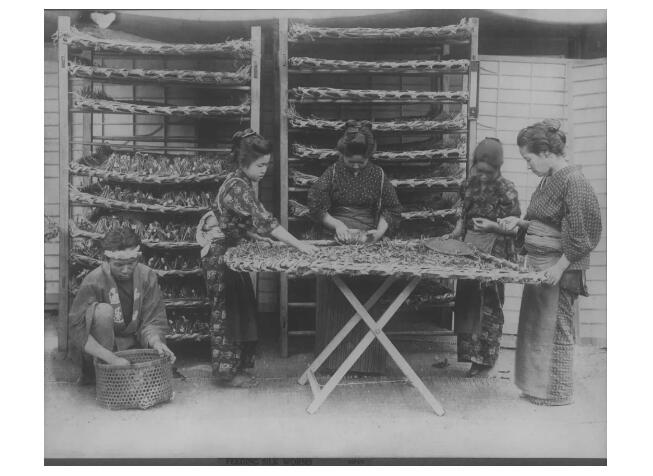 這張照片顯示的是“在出口商得到茶葉之前,先把新鮮采摘的茶葉蒸熟,然后再焙干。”茶葉在采摘后,先要將它徹底的干燥、分類,并仔細包裝,然后茶在日本市場上出售。出口時,茶葉必須再次干燥,以防止在長途海上航行中由于潮濕的鹽空氣而變質,還要把它裝在裝有鉛箔的盒子里。在海港也有大型工廠,在那里也可以進行最后的干燥和包裝。在這段時間里,茶是用所謂的平底鍋燒制的。這些半球形的大鐵鍋,每個鍋下面都有一個單獨的木炭火,每個鍋前都一個女孩在工作。一個平底鍋里大約要放五磅的茶葉,女孩用她的手攪拌它約一到兩個小時,直到它完全干透,然后幾個人把茶裝在大籃子里。注意,每兩個平底鍋之間有一個小盒子,這些盒子里放有一些物質,如橘子皮、茉莉花、玫瑰葉等,用來為紅茶調味,或從包裝盒上的標簽上把綠茶染成顏色。這可以看出,出口商是美國人。