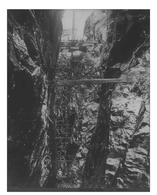 蓋隆有一個烏筆坑或礦坑,石墨(鉛或黑鉛)是從中獲取的。僧伽羅族的工人,幾乎不穿任何衣服,他們用粗糙的木制梯子和土生土長的繩索上上下下。梯子濕漉漉的,上面覆蓋著石墨或鉛,太滑了。開口上方,一根絞索從底部拖上了一個爐子,從圖中看到了長長的垂直雙鏈。在這張照片中,我從地面的表面到了大約90英尺的深度。這些礦井中,都配備了蒸汽泵,用于排除流到礦井中的雨水,或從塔瑪里爾的斯普林格流來的水。口袋或凹槽,通常由純石墨組成,從最小尺寸到一碼或更寬不等。石墨被運到表面后,會進行清洗,并與其它與石墨混合在一起的巖石分離。然后,它通常會被送到科倫坡,在那里更仔細地清洗、篩選,并根據不同的質量分類,用木桶包裝后出口。一般等級分為大塊頭、普通、碎片、灰塵和飛塵。錫蘭生產的大部分石墨出口到美國,其中一些被送往英國、德國和歐洲其他地區,它在紐約、波希米和奧勒等地的開采量要小得多,主要用于制造坩堝、LASD面板、鏈條和機械潤滑油,等級較差的則制造爐子,用于鑄鐵制造,生產黑色油漆。
