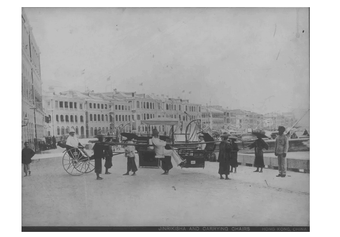 這張照片是在中國香港的海濱拍攝的,它展示了一種在東亞沿海城市非常普遍使用的交通工具。在世界的那個地區,人類勞動力非常便宜,而馬匹卻很少。因此,在陸地上旅行的人,通常坐在椅子上雇用苦力抬著他們走。而輕便的馬車則是由白人引進的,在中國和日本,一天可以用十五美分或二十五美分的價格,雇傭一個人力車。那些跑著拉人力車的人很有耐力,主要靠大米過活。人力車只能在大城市或大城市附近使用,因為在中國和日本的鄉村地區,實際上沒有道路,任何類型的輪式車輛都是無用的。由于這個原因,攜帶椅子是很常見的。圖中顯示了兩種類型。中間的那個人坐在一個只有一個座位的座子上,有一個棚帳和一個腳架,捆在兩個可以扛在肩膀上的長竹竿上。拿著雨傘的女士,坐在另一個像箱子一樣的椅子上,苦力抬動時的長桿子系在兩旁。寬邊帽一般由竹子制成,是中國人特有的頭飾,而灰頭盔則是許多溫暖氣候下白人男子通常戴的。香港的英國屬地是一個小島,長約11英里,寬2至5英里,靠近中國海岸。它是世界上最重要的商業城市之一,擁有極好的港口。背景中的建筑物被商業機構占據,其中大部分由歐洲人經營。當然,他們的建筑風格是歐洲式的,而不是中國的。