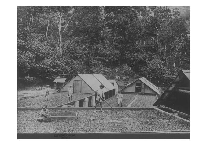 可可的種子比較小,在不同的國家收獲方法有很大的不同。首先是把它從樹上砍下來,堆在干燥的地方晾曬好幾天,然后將種子取出來再次堆積數天,直到有一定程度的發酵。據說,這可以提高豆類的質量。豆子通常被涂上紅色黏土或其他紅色素,那是為了防止昆蟲咬吃,也是因為紅豆比淺色的紅豆要好得多。接下來,豆子就可以干燥了,這是一個需要非常小心的操作。在大多數國家,可可豆是在露天堅硬光滑的泥土或墊子上干燥的,現代種植園會用大型水泥烘干地板,如圖中所示,在任何時候都可以在屋頂晾曬可可豆。這些在熱帶美洲被稱為“露臺”的拉爾加地板上,豆子被稀薄地攤開,并且被耙了至少十天,直到它們完全干燥。在日照不夠穩定的地方,也會采取人工加熱的方式。干豆子會裝在袋子里,從生產地運到工廠加工。在生產巧克力和可可的工廠里,可可豆會被清洗、烘烤、破碎、研磨和其他加工。特立尼達生產高質量的可可,島上的許多種植園都是按照全新的方法經營的。在這幅圖片中,干燥場地建在離地面幾英尺高的地方,屋頂布置得很好,萬一下雨,他們可以在很短的時間內將干燥的地板遮蓋上。正在工作的工人們都是東印度人。特立尼達的勞工來自非洲裔黑人和東印度群島的馬來苦力,他們是根據合同來這里的,合同期限為數年。這些馬來人,其中大多數是穆斯林,是一個勤勞的階級。在他們的合同到期后,他們常常會留在島上,并成為金邊的定居者。