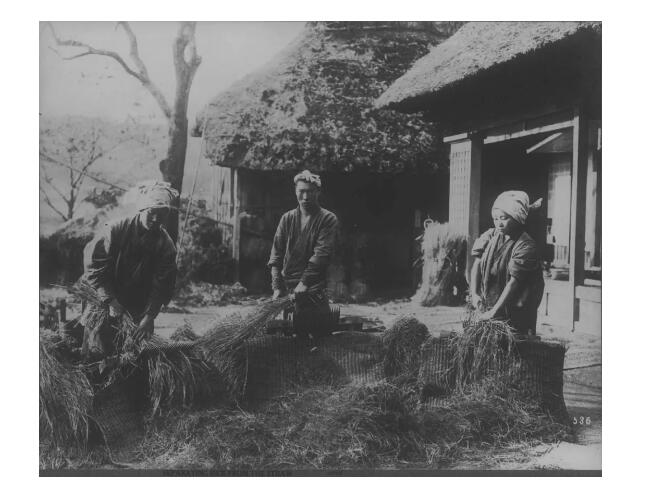 這幅圖片展示了稻穗是如何從稻草中被分離出來的。日本人試圖在不破壞稻稈的情況下收獲稻子,這樣他們就可以用它做墊子或其他物品。工人們站在有許多長而直立的尖或牙齒的機器前面,喂進去一小捆稻稈,就把稈上的谷粒脫下來了。這時的稻谷仍被外殼覆蓋,在準備食用之前必須將其脫殼清洗。注意那些用稻草做的墊子,當它們從莖稈上被扯下來時,它們的頭會掉在下面。這是一個典型的收獲稻子的情景,背景是一個農民的房子,這在日本農村地區是常見的。這項工作由一名婦女、一名青年男子和一名女孩完成,很可能是該婦女的兒子和女兒。這是日本的特色。在日本,所有的家庭成員都在做他們的工作。