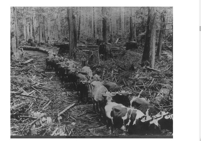 這張伐木場景的照片,顯示了哥倫比亞森林中砍伐和運輸木材的方法。牛被鏈子拴在原木上,被人牽著走。卡利被稱為“牛拳手”,當營地建在高處時,有各種其它方法用來運送原木。每當靠近一條大河時,原木就被拖到那里,然后漂浮下去,再由小型伐木鐵路將他們拖到北部各州,那里積雪充足。所有的伐木工作都是在冬天進行的,因為可以用雪橇拖著在雪地里走。當附近沒有河流時,運輸通常由鐵路來完成。高大的樹樁,通常是從西部森林中砍伐的,表明在采伐方法上與通常在東部推行的政策有著驚人的相似。在那里,木材被砍得離地面越近越好,這樣才能從樹上得到最多的木材。一般來說,太平洋沿岸的樹木開采,都是從高出地面的部分砍伐的,這樣比離地面近的地方更容易操作,質量也更好。在圖的中心,可以看到這樣的樹樁,樹木在森林中被砍伐,修剪并砍成原木,運到鋸木廠的鋸齒上,原木被切割成粗糙的木材,如橫梁、龍骨、板子、板條等。在刨機中,粗糙的木材被刨成厚厚的、有邊的板材,然后被加工成門、壁板、地板、樓梯等。不列顛哥倫比亞省位于英屬美洲西南部,是加拿大最富有的地區之一,它最大的財富來源是它的礦藏,其次是不列顛哥倫比亞省的森林,它擁有北美大陸上最大的可供銷售的木材資源,如阿拉斯加北部一樣,海岸邊陸地上的森林被大量砍伐,森林線緊跟在海岸線環繞著山腰,每年總采伐量超過1260萬英尺,其中最重要的是道格拉斯冷杉。