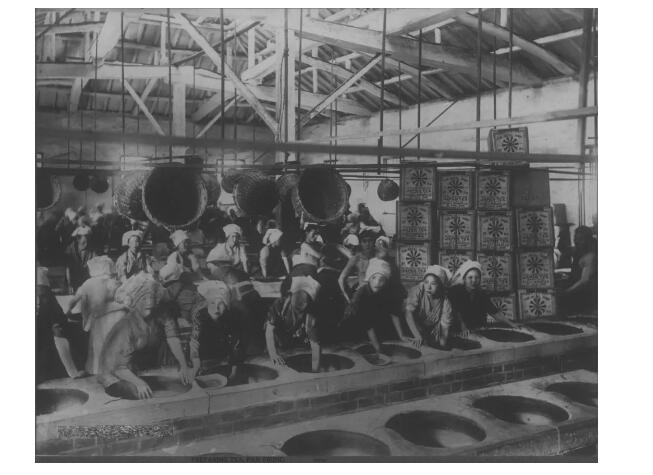 這張照片拍的是上海一家現代蒸汽絲線廠的一個房間,做這項工作的姑娘們排了四隊,每個女孩面前都是一個裝滿溫水的盆,她腳下的地板上有一個籃子,里面裝著要抽絲的蠶繭,有時多達20多個。蠶繭漂浮在溫水的表面,很快粘稠的物質就把纖維以繭的形式粘合在一起變軟,纏繞的外層絲質就可以脫落。由于它們被粘膠覆蓋而相互粘合在一起,取自幾個繭的纖維合在一條線上,穿過一系列作為導軌的玻璃珠孔,從而到達位于房間兩側的一個大盒子中的一個旋轉卷筒中。這些生絲卷筒,大量出口到歐洲和美國。當它上市時,總是扭曲并固定在一個特殊的結或漢克上。絲綢面料的制造商首先清洗生絲,將其從一些粘稠的材料中提取出來。由繭的不可卷部分(外層和內層)組成的廢絲或牙線被紡成線,就像紡棉線一樣。紡絲比拋絲便宜,被制成低檔的織物。