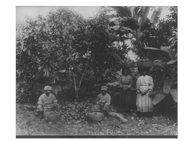 牙買加可可和巧克力,是一種小樹(可可豆,草科)的種子,生長在熱帶。這幅圖顯示其中一棵樹上掛著幾個水果,坐在樹下的兩個黑人婦女正在打開果實。他們用大刀把它們切下來,稱為“大砍刀”,然后把種子連同它們所嵌入的果肉一起取出。這是在地上的籃子里看到的。種子周圍的果肉被留下幾天,以使紙漿發酵或部分腐爛,然后紙漿被沖走,剩下干凈的種子。每顆種子大概有一英寸長,通常是在太陽下干燥的,但有時是通過人工加熱干燥的。可可豆被烤熟,磨成粉末,制成蛋糕,形成巧克力。甜巧克力需加糖和香草。可可豆富含脂肪油,在可可粉生產過程中會被部分去除。可可豆在大多數熱帶國家種植,主要出口國是厄瓜多爾、委內瑞拉和特立尼達。另外兩名黑人婦女站在一棵年輕的香蕉樹下,頭上放著大籃子,裝滿了可可果。這些是他們剛從附近的樹上帶來的,準備打開。這種隨身攜帶物品的方式,幾乎在所有國家的黑人中都很常見。黑人婦女經常在頭上綁一塊布,就像畫中的那些。
