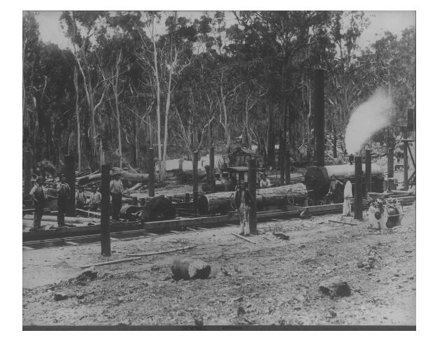 這張照片是西澳大利亞州韋格里森林里的鋸木廠。兩個焦油圓鋸由蒸汽動力驅動,在圖片的中心,一根直徑幾英尺的圓木被固定在軌道上,準備在旋轉鋸子上切割。當整根圓木被縱向切開后,它會被移動一英寸或兩英寸,然后重復操作,直到整個圓木被切成木板為止。這張照片是在工棚建成前拍的,可以看到準備支撐屋頂的立柱已經豎妥,背景是工人的帳篷,以及小機車、原木和運木材的鐵路。右邊是一臺卷繞的機器,用來把原木拉到鋸軌上。工棚一般會建在容易獲得大量木材的地方,通常在這種情況下,鋸木廠是直接建立在森林中的。當原木被砍伐在森林的某一地方時,這些小工棚就會被移到這個地方。通常,大型鋸木廠位于一些距離森林較近的溪水邊,圓木被聚攏在一起漂浮過去。當鐵路不直接穿過森林的時候,這是一個合理的方案,圓木不出森林就被鋸好了。鋸木廠也可以建在鐵路邊上,這樣切割后的木材就可以很容易地運走。從畫面上可以看出,這里使用的是圓鋸,其實也可以使用帶鋸。使用帶鋸后,幾個鋸子可以平行運行,一次從同一圓木上可以切出幾塊木板來。