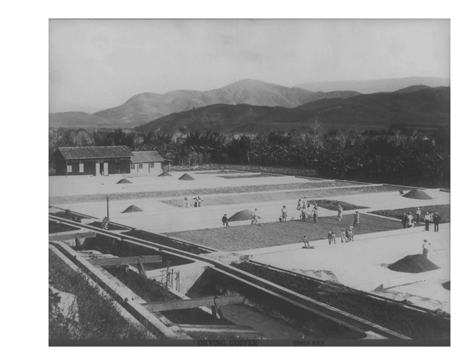 哥斯達黎加商業咖啡是一棵小樹的種子,這種樹有兩個栽培品種——阿拉伯品種(f/e Arabi)和利比里亞品種(Ca Rhi)。阿拉伯咖啡樹原產于阿比西尼亞,現在種植于所有重要的咖啡生產國。巴西供應世界上四分之三的咖啡,但其他熱帶國家也大量生產咖啡。成熟的咖啡大小和形狀與櫻桃相似,它們呈鮮紅色,長在樹枝上。在漿果中,兩個黃色的種子或“豆子”彼此平展,被包裹在果肉中,每一顆豆或種子首先被一個非常薄的膜(“銀皮”)覆蓋,然后用厚厚的、堅硬的皮(“干草”)覆蓋。當漿果從樹枝上摘下來后,這些覆蓋物必須被移除。在世界上的一些地方,漿果首先進行干燥,然后硬化的外殼被打破,這是比較常見的方法。咖啡漿果是從田里運到“紙漿機”的,在這臺機器里,果肉被粗略地碾碎和沖走,一些果肉仍然附著在種子上。因此,他們被放在一個大水池中洗,如照片的前景所示,并留兩到三天發酵。這樣,剩下的紙漿顆粒就會松了,可以在噴嘴池里洗掉。在洗咖啡的過程中,臟水會被反復抽走,直到咖啡豆(現在被堅硬的黃色羊皮紙覆蓋)完全干凈。羊皮紙咖啡必須立刻干燥。在設備完善的咖啡種植園里,通常有水泥晾曬場,就像在圖片中看到的那樣,咖啡可以在陽光下被曬干。在這些被稱為“天井”的大地板上,豆子散開了,它們不時地被耙過,以便它們可以迅速而均勻地干燥,這取決于天氣。咖啡在十到二十天內就會干涸。為了保護豆子不受雨水和露水的影響,它們有時會堆積起來,并覆蓋在大的棕櫚墊上,就像在這張圖片中所看到的那樣。在咖啡收獲期間經常下雨的地方,咖啡豆是在屋頂的地板上干燥的,或者是在烘干機里用人工加熱干燥的。咖啡上面覆蓋著羊皮紙,第一種是清洗機,第二種是更厚實的碎紙機,然后把羊皮紙刮走。下一臺機器是一臺磨光機,擦去薄的銀皮。這兩臺機器經常被合并成一臺。徹底清洗過的咖啡放進袋子后,就可以裝船了。在使用之前,它必須經過烘烤和研磨,這通常是在它被使用之前的一段短時間內完成的。