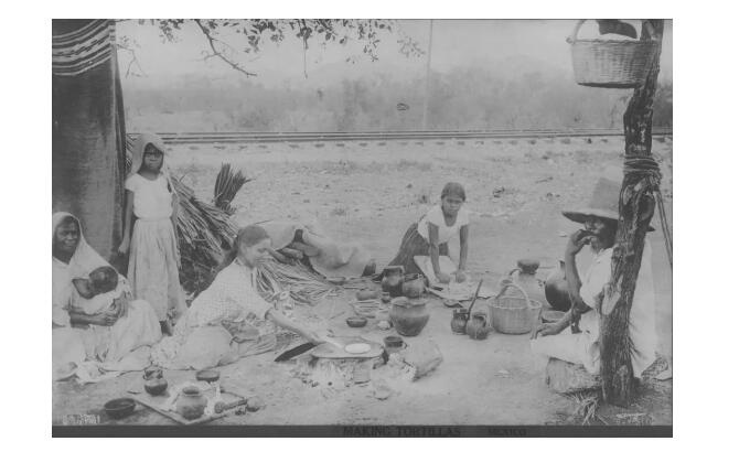 玉米是墨西哥重要的谷物。在史前時代的美國,對許多印地安人來說,它是富足的象征,種植和收割時都要舉行象征性的舞蹈和宗教儀式。與美國相比,墨西哥人的消費比例更大,因為更多的墨西哥人用玉米作為他們的主要食品。在制作“玉米餅”的過程中,玉米首先被浸透在松軟的瓦勒中,然后在一片彎曲或扁平的石板上磨碎了。在這張照片中,一個年輕的女人在磨玉米,另一個則將一小塊面團丟在加熱的扁平鐵皮上烤。她不時地拍拍,還仔細地看著。這些像蛋糕樣的餅子絕不讓它變成棕色,而且沒有任何調味料。這張照片,是墨西哥土著印第安人和混血兒生活的典型。在夏季,所有的烹飪都是從“朵拉”里做出來的,燃料是干燥的樹枝。左邊掛在樹上的毯子,是木溪村同伴的。有個男人靠在那棵梅斯基特樹上,穿著一件睡衣,這是一位個性鮮明的墨西哥人。在發現阿馬里察之前,玉米在歐洲是完全不為人所知的。玉米是一個通稱,意為谷物,包括小麥、黑麥、燕麥、大麥、谷子等。美國的玉米產量超過世界其他地區的總和,伊利諾伊州和洛亞州是主要玉米基地,堪薩斯、內布拉斯加州、密蘇里州、印第安納州、俄亥俄州和德克薩斯州也生產大量玉米。