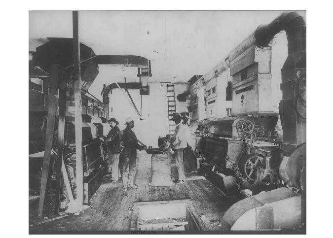 軋花機左邊有一個模具,靠近天花板以上還有一個大盒子,稱為攪拌器。在那里,對棉花進行了初次的清潔,使棉花和棉枝花殼脫離開來。從攪拌器出來后,棉花是由一個移動皮帶運載到下一工序的。當喂食器被填滿后會有一些落在地板上,工人可以從那里撿起來再次喂給機器。由于這種設計,農民運棉花的車并不必等待,可以直接被卸下,輸送到軋花機里加工。這張圖片顯示的所有軋花機,不是最常見的類型,而是所謂的雙排扣軋花機。
