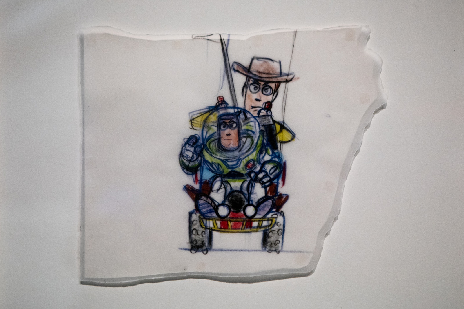 《Toy Story》系列陪伴了不少人成長,展區為大家帶來多幅角色設計草圖,當中包括三眼仔 Alien 及薯蛋頭 Mr. Potato Head,好讓大家了解它們背后是如何創造出來。同時,亦帶來了電影的分鏡圖及各個角色的樹脂鑄模,如 Lotso、Woody、Buzz Lightyear 等等。據 Pixar 動畫制作室博物館及展覽節目高級經理 Maren Jones 的介紹所指,樹脂鑄模的用途是令畫家可以多角度及立體地繪畫角色。在畫家繪畫好平面圖后,由 2 位專業人士以黏土將角色制成立體,了解這角色是否能夠立體代并方便于過程中作出修改。完成好的黏土雕塑會倒模,再以樹脂制作出來方便畫家使用。