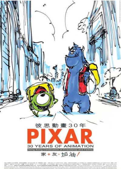Pixar 動畫制作室自 1986 年在美國成立至今已 30 年,一直以來創作出多個感動人心的故事。Pixar 于 2011 年便曾在香港舉辦展覽,今回他們以「友情」和「親情」為主旨,打造出《彼思動畫 30 年:家+友?加油!》展覽,提醒大家人生旅途上雖有高低起跌,但總有朋友和家人為我們「加油」。展覽將展出由各種傳統媒介創作的精選作品,當中包括手繪素描稿、油畫、分鏡圖及雕塑等,向公眾展示 Pixar 藝術家在歷年來的創作成果,亦是每部動畫電影制作過程中不可或缺的一部分,同時讓大家了解其背后的創作過程和所運用的藝術技巧。展區以《Up》、《Finding Nemo》、《The Incredibles》等 12 套經典動畫作品為區分。