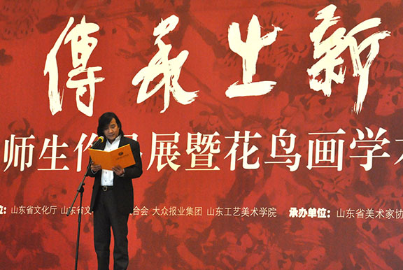 山東工藝美術學院副院長苗登宇致辭。他說,郭志光先生是一位成績突出的教育家,他1974年調入山東工藝美術學院,40多年來,為山東美術界培養了一大批優秀人才,可以說桃李滿天下。這次展覽既是郭志光師生藝術創作成果的一次全面展示,也是山東美術界尤其是花鳥畫的一次盛會。郭志光教授在傳統花鳥畫中熔鑄了新時期的人文氣象,推陳出新,南北融匯,開創了屬于自我的新畫風。他倡導的以創作促教學,對當下山東工藝美術學院建設實踐教學型藝術大學仍有促進作用。