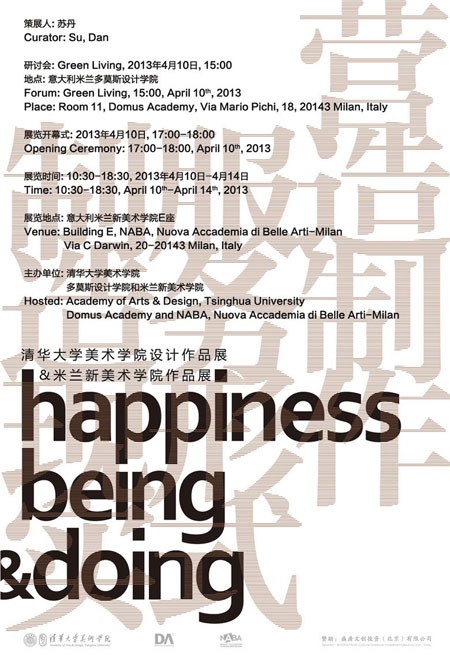 兩校展覽組織機構確定展覽主題為:happiness/beingdoing,旨在探討當代社會和經濟發展條件下,設計的狀態和關心的問題。展覽主題在“個體與群體/individual and collective”的大方向下,兩校各自延伸出兩個子話題:即意大利naba新美術學院以“happiness”為題展開,清華美院副院長蘇丹教授策展的部分以 “beingdoing”為題展開。展覽期間將舉辦主題為“Green Living”的設計論壇。探討當代設計面對的可持續發展問題的挑戰。