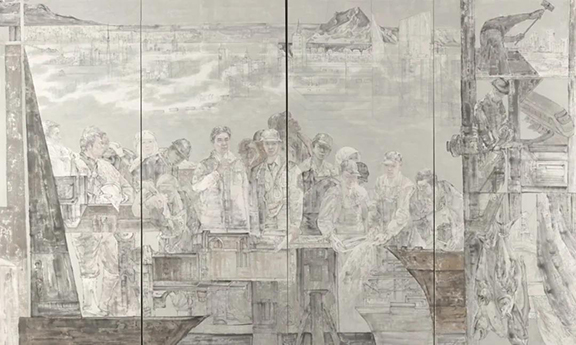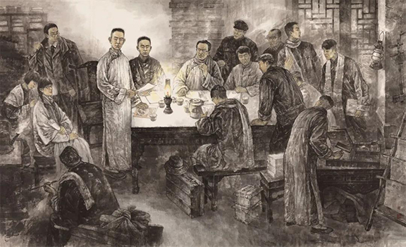 王磐德、周群 《寒夜星光——1921·濟(jì)南馬克思學(xué)說(shuō)研究會(huì)》 國(guó)畫(huà) 220×360cm