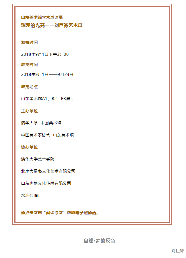 “渾沌的光亮--劉巨德藝術展”和“尋歸自然--鐘蜀珩繪畫作品展”巡展,將于2018年9月1日在山東美術館展出。展覽由清華大學、中國美術館、中國美術家協會、山東美術館聯合主辦,清華大學美術學院、北京大易書文化藝術有限公司、山東尚博文化傳媒有限公司共同協辦。這是繼中國美術館學術邀請展、河南省美術館學術邀請展之后的山東美術館學術邀請展。