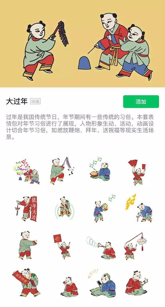 同款表情包則對年畫中的人物進行了一系列動態效果設計,人物形象生動、活潑,再現了過年期間燃放鞭炮、敲鑼打鼓、送祝福等一系列年節習俗的熱鬧場景。