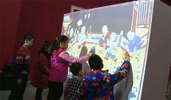 互動裝置藝術作品《大過年》在創作時對原畫進行了數字化重構,加入聲音視覺可視化效果,并結合互動體感交互技術,體驗者通過觸摸裝置上的觸摸感應器,觸發電腦相關程序播放動畫,通過投影儀將動態光效投射到靜態裝置作品上,使體驗者與年畫人物進行交互。數字媒體技術的展示讓年畫更加“活”起來,通過體驗者與作品的互動體驗,讓觀者在娛樂中加深對木版年畫這種傳統藝術形式的認知,喚起人們對年畫的熱愛,從而促使人們對中華優秀傳統文化的熱愛。
