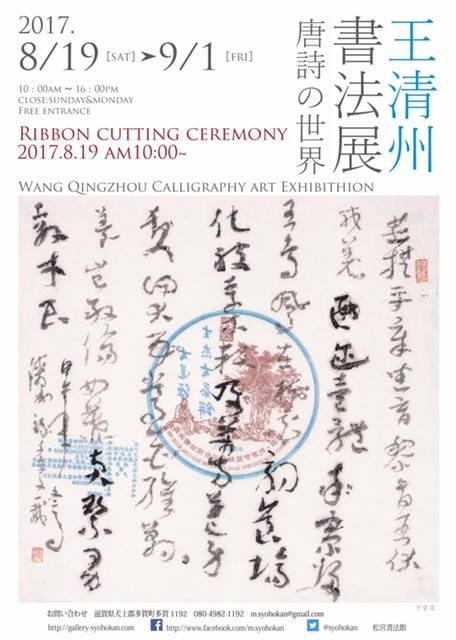由日本松宮書法館主辦的“王清州書法展-唐詩的世界Wang Qingzhou Calligraphy Art Exhibition”,將于2017年8月19日上午在日本松宮書法館開幕。將展出他近幾年創作的草書和隸書作品。王清州自幼由其祖父王瑞西啟蒙學習書法,筆耕不輟,苦臨名帖,初習唐楷漢隸和北碑,后嘗試將碑帖相融,追求雄渾厚重中蘊含靈動的藝術風格,又在篆刻、中國畫小寫意、素描、油畫、抽象畫等藝術形式做了長時間的探索,滋養了他的書法作品,并已初步形成了自己的面貌。