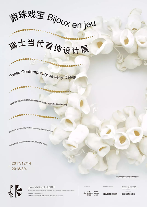 2017 年 12 月 14 日至 2018 年 3 月 4 日,psD(上海當(dāng)代藝術(shù)博物館設(shè)計(jì)中心)將為公眾呈現(xiàn)“游珠戲?qū)殹鹗慨?dāng)代首飾設(shè)計(jì)展”。展覽由瑞士洛桑當(dāng)代設(shè)計(jì)與應(yīng)用藝術(shù)博物館(mudac)策展,通過“講述”、“裝飾”、“用途”、“形狀”、“制造”五個(gè)板塊,展示瑞士上世紀(jì) 60 年代至今三十五位設(shè)計(jì)師的近三百件首飾設(shè)計(jì)作品。該展曾先后在西班牙巴塞羅那和瑞士巴塞爾展出,中國上海成為其世界巡回的第三站。