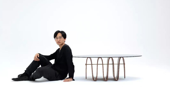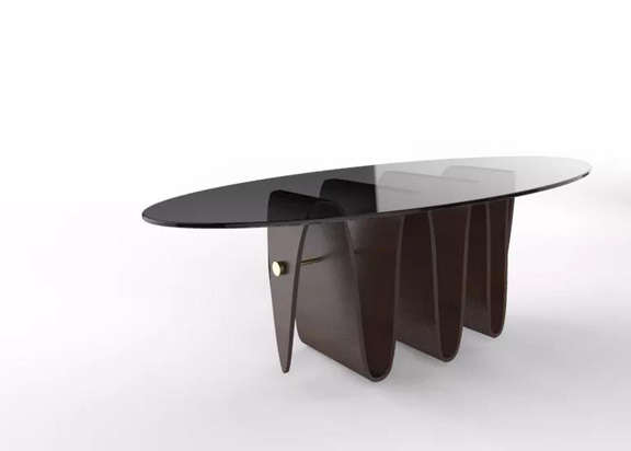 "波浪茶幾“是榏鎂家具李培新設計師(RED策展人之一)設計,由上海家具協(xié)會組織抽簽,最終由上海著名品牌亞振家具進行打樣制作,制作過程極付挑戰(zhàn)性,需要將木皮一片一片放入模具,壓制而成。相當于用一種新的重組方式達到多層板生產之前就可以定型的工藝。這樣對多層板的浪費也是減少到最低。為了讓多層板更穩(wěn)定,且有張力,他們選了銅作為固定多層板形狀的一個拉桿。